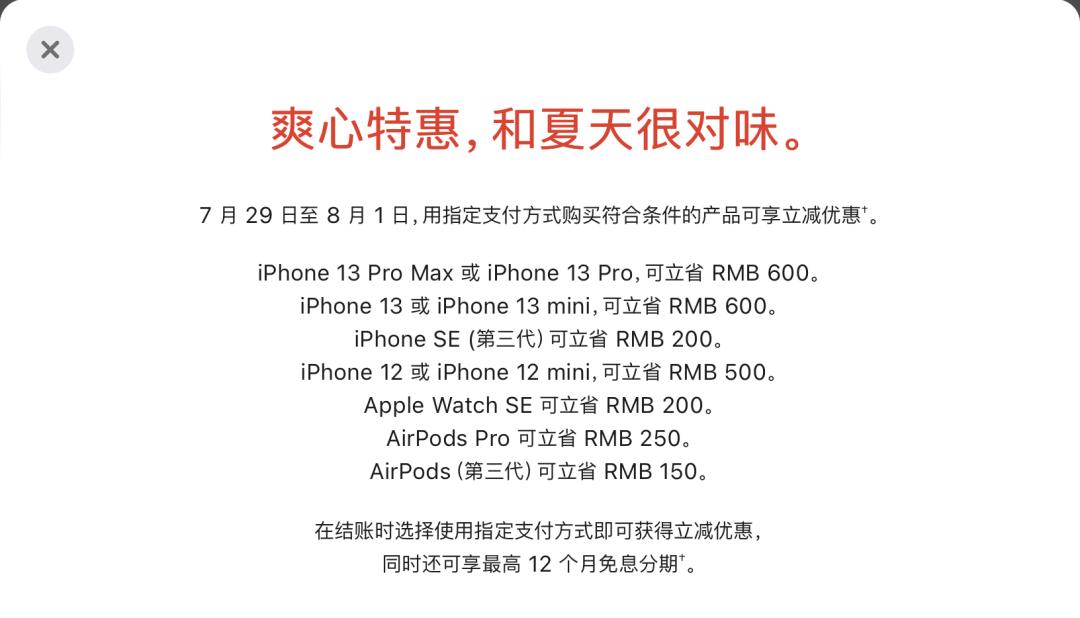 前段时间苹果开启夏日促销的消息大家应该有所耳闻。不同于过去“不出新款不降价”的铁面形象,今年的苹果除了在常规的教育优惠与开学返校优惠之外,还连同特定支付渠道对iPhone、Apple Watch、AirPods的特定型号推出了专门的立减优惠。以最多人关注的iPhone为例,iPhone 13 Pro系列优惠立减600元,前年推出的iPhone 12与iPhone mini也将立减500元,有真无线耳机“常青树”之称的AirPods Pro也促销降价250元。