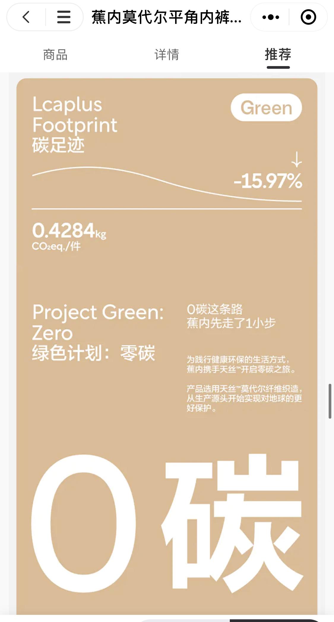 蕉内通过使用零碳天丝纤维并对生产节能进行流程优化,降低了内裤制造的碳排放和污染。消费者可以通过扫描产品吊牌以及包装上的二维码,获知该产品“碳足迹”。对于无法避免的碳排放抵消,消费者可领取植物种子,蕉内将用礼品激励用户培育植物吸收二氧化碳。