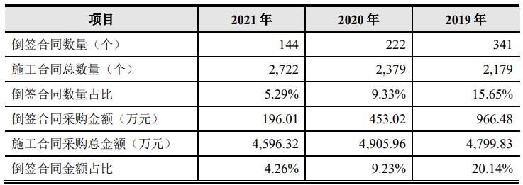 值得注意的是,督导组抽取的54份施工合同中有6份为倒签合同。科拓股份进一步说明,报告期各期,倒签合同数量占比分别为15.65%、9.33%和5.29%,倒签合同金额占比分别为20.14%、9.23%和4.26%,数量占比及金额占比逐年下降。