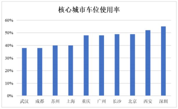 中金企信统计数据显示,我国有九成以上城市的整体车位使用率在50%以下,北京、上海、广州、深圳四大一线城市的车位使用率分别为49%、40%、48%和55%。