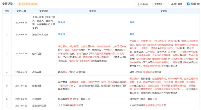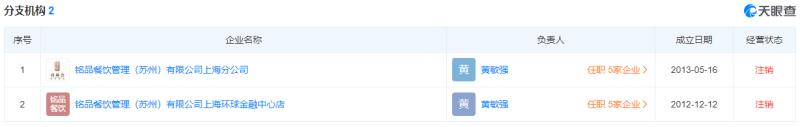 蓝鲸财经记者在天眼查发现,铭品餐饮2020年4月24日更名为铭品(苏州)环保科技有限公司,同年9月,法定代表人由黄金练变更为向珊。其在上海的两家分公司均已显示注销,注销时间分别为2015年9月和2016年1月。