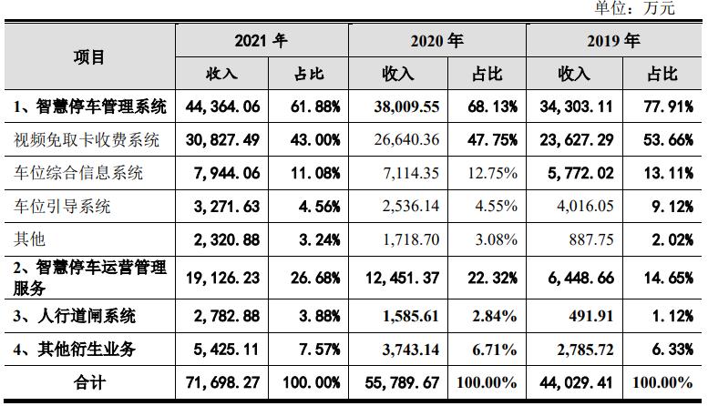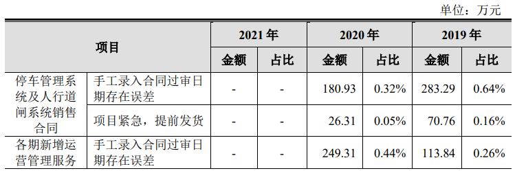 在主营业务智慧停车管理系统方面,其存在缺失货物签收或工程验收原始凭证的问题,以收到客户除质保金以外的销售回款时作为确认收入时点,2018年至2021年1-6月,相关收入金额分别为1994.90万元、4573.50万元、4299.20万元和1931.88万元。