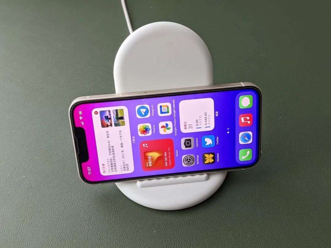 除此之外, iPhone 13 mini 的「五短身材」还引发了另一个关于充电的问题——我日常使用最多的无线充电器其实是谷歌的 Pixel Stand ,干净的白色机身算是我觉得美观与功能性上一个比较巧妙的交叉点。但是 13 mini 的身高刚好会让自己的无线充电线圈对准 Pixel Stand 双线圈的接缝处,唯一的充电方式就是把 iPhone 横过来,偏偏这种时候 Face ID 又因为机身横置而无法解锁,失去了立式无线充电支架的意义,一番折腾下来还是得回到普通的桌面充电板。