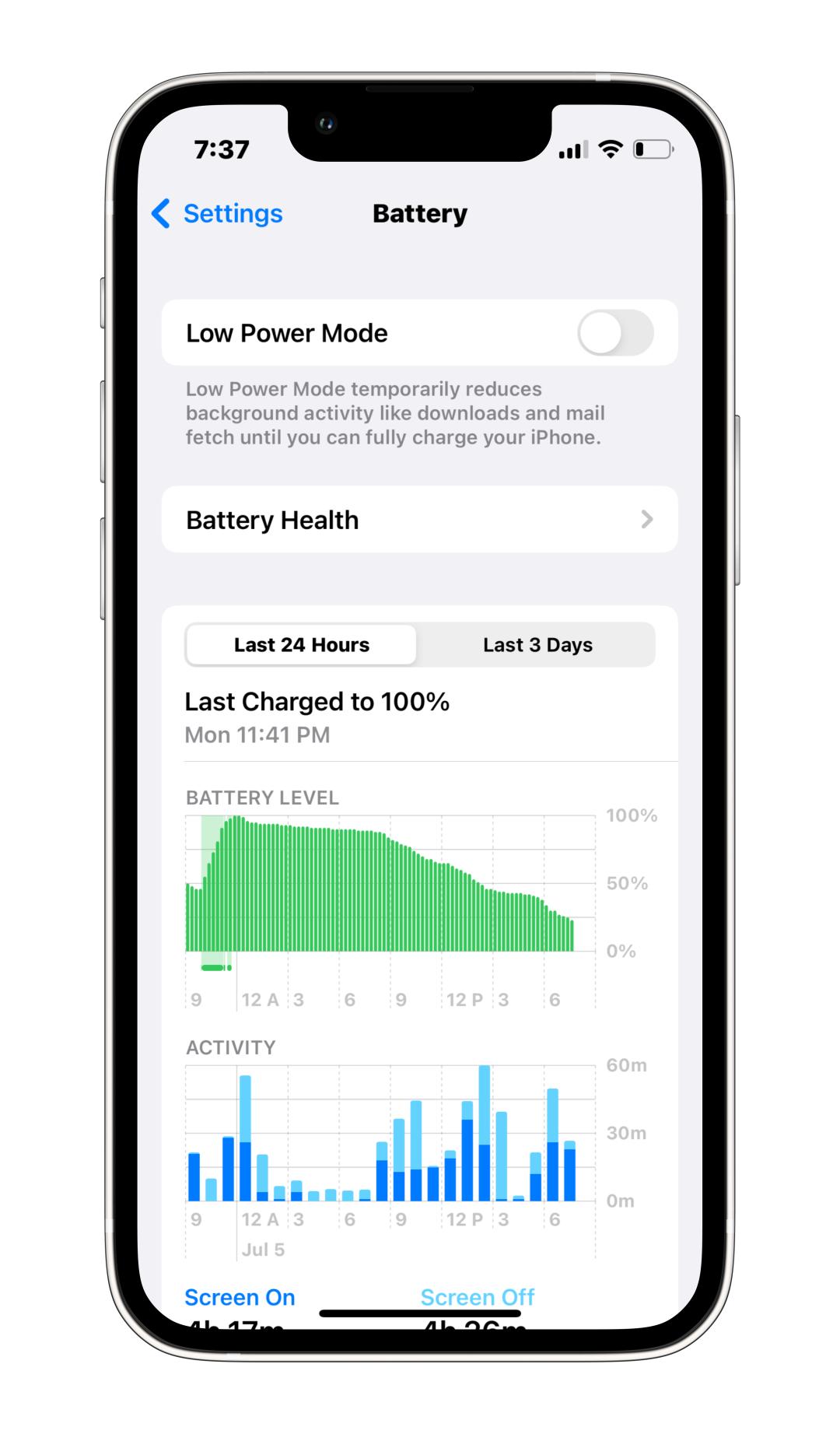 与官网上的标准续航测试模型不同,日常使用中的续航表现是一个非常主观的指标,放假在家与开学上课时的使用强度自然也无法同日而语。我总体上是一个对于手机使用强度很低的人,基本上 iMessage 、Telegram 与 TIM 涵盖了我的手机社交, Apple Music 、YouTube Music 与 Podcast 涵盖了我的内容消费需求。App 资源库中余下的要么是每个月也就打开一两次的银行 app ,或者是 YouTube 与 Twitch 这些我更常在电脑上使用网页版的内容平台。