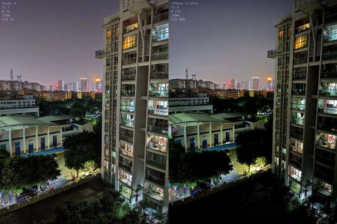 左为 Pixel 5 ,右为 iPhone 13 mini ,均为手持触发自动夜景(未使用摄影风格)