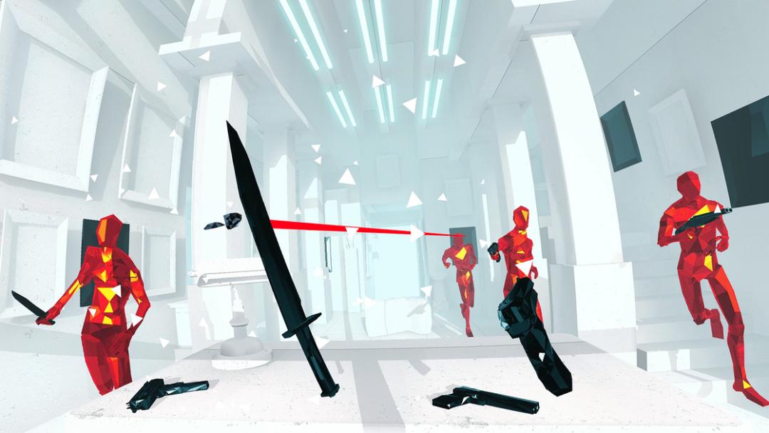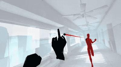 Super Hot 最过瘾之处在于其代入感。这款游戏很好地利用了 VR 的特点,不需要你做行进之类的大幅运动,但为了躲避子弹和攻击,你必须忽站忽蹲,忽左忽右,闪转腾挪。同时,你还得及时捡起手边的武器丢向敌人,并根据敌人的位置和自己的习惯合理分配左右手。更刺激的是,很多武器需要你在半空中接住(譬如击毙敌人后对方手里掉落的匕首),然后火速丢出,完成空中接力——玩的过程完全就是以第一人称的身份进入了动作电影,面对从不同方位冲出来的敌人给予还击,很是带劲。如果玩的时候再带上几分「我就是 James Bond 」的中二幻想,那游戏体验就更棒了。