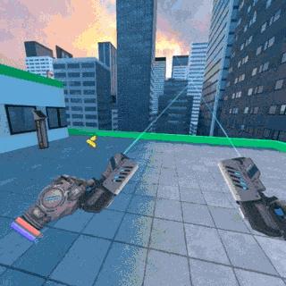 Resist 讲述了一个典型的「反乌托邦」故事,剧情无非还是赛博朋克反抗军的那一套,但呈现手法非常新颖:可能是为了最大化 VR 游戏的感官冲击,本作给予了主角依靠钩索在高楼大厦之间飞檐走壁的能力,玩家需要在进行机动的同时拔枪对抗敌人,这种华丽的战斗风格颇有些蜘蛛侠 + 死侍的即视感。