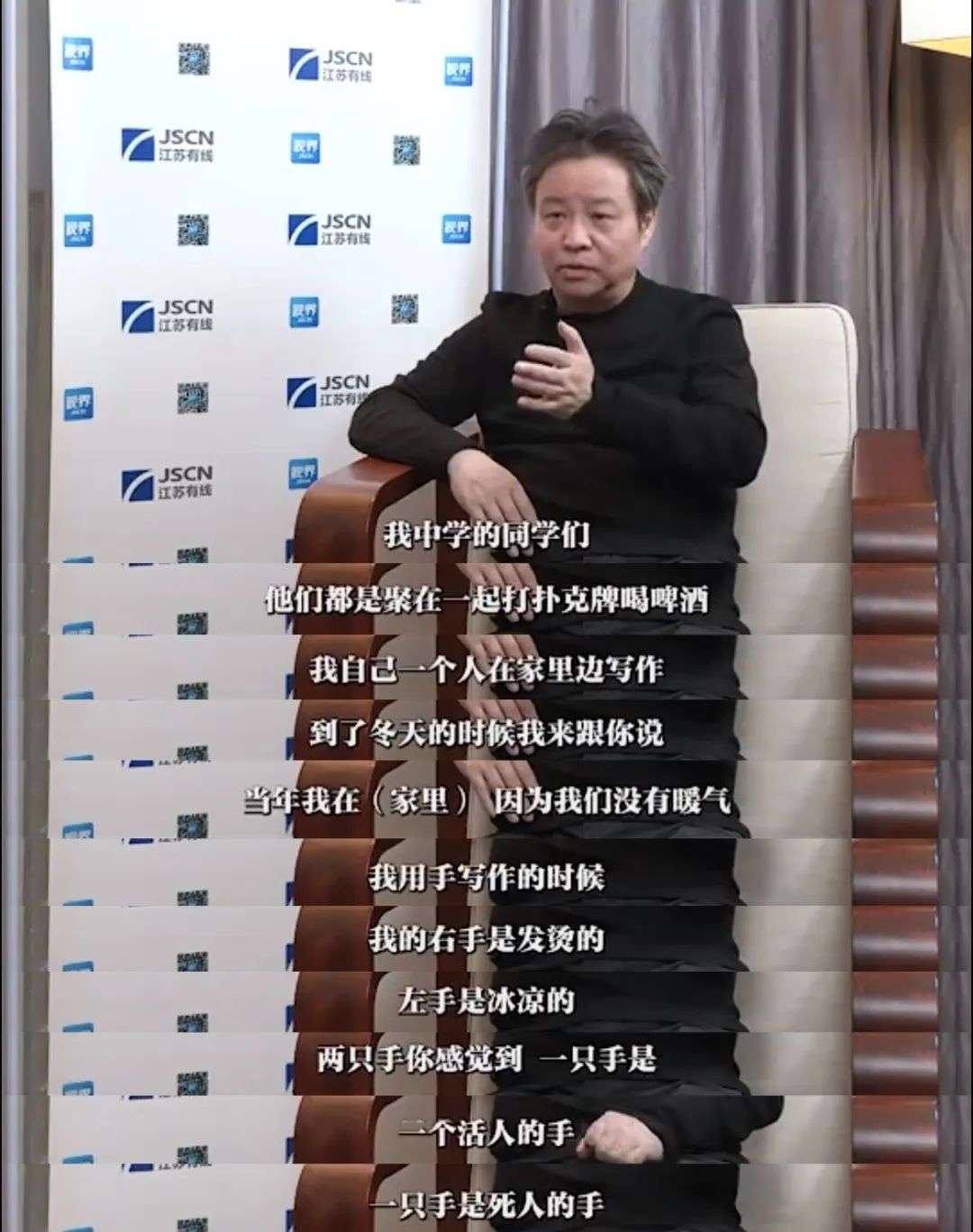 余华提到,自己当年写作时,冬天家里没有暖气,用来写作的右手烫得可怕,左手却冰凉无比。