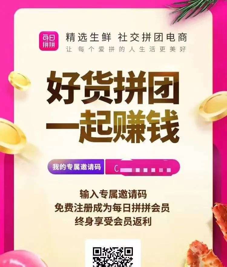 每日拼拼内测版上线时,把最初始的一些邀请码给自己员工,让其自行拓展。拿到专属的邀请码后,用户利用微信的私域流量拉粉丝建群,邀请亲人、朋友注册下载。通过自身邀请码拉拢到的直接、间接用户所产生的交易额,都会给予拉新者一定佣金分成。