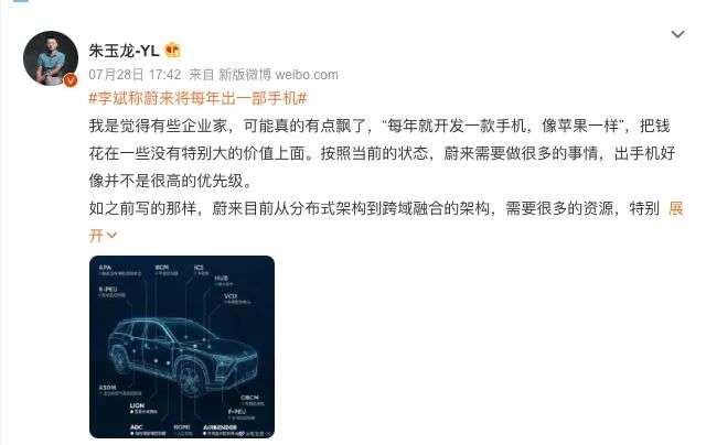 针对李斌称蔚来将每年出一部手机这一话题,汽车电子资深工程师朱玉龙在其个人微博上点评称,“我觉得有些企业家,可能真的有点飘了。按照当前的状态,蔚来需要做很多的事情,出手机好像并不是很高的优先级。”
