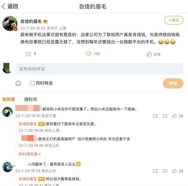 沈义人的评论也引发了网友的讨论,有网友称,“蔚来和小米合作不就完事了,然后小米还能再冲一下高端。”“外包给小米,然后牌子上印蔚来,最后不要告诉任何人我觉得非常OK。”