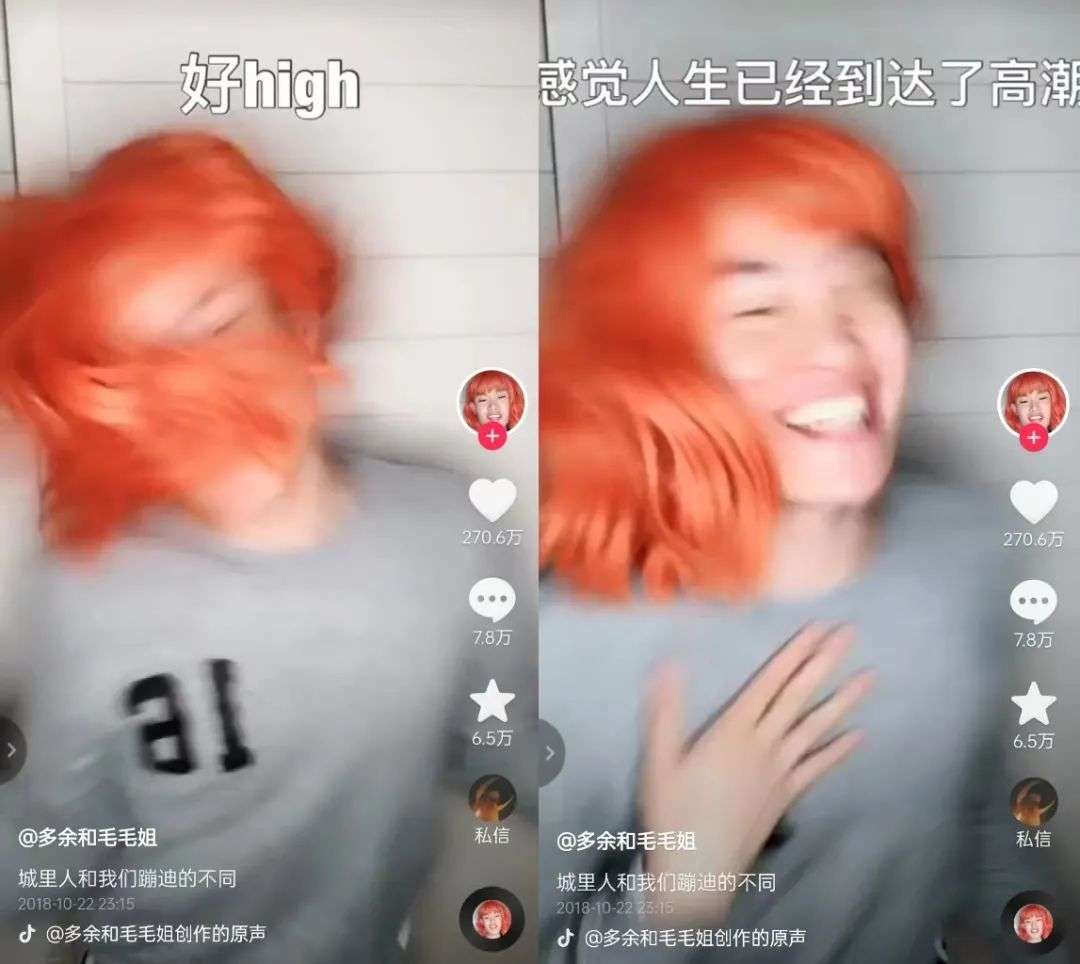 “多余和毛毛姐”是最早一批活跃于短视频平台的方言创作者,2018年,他用贵阳毕节方言夹杂着一口不甚标准的普通话创作出了“好嗨哟,感觉人生已经到达了高潮……”这段极其经典的对话。一头橘发,摇晃着身躯,刻意拉高的声调,使他这句看似平常的感叹语极具魔性,引发了一众网友和明星的模仿,短短几个月内,其视频在抖音平台播放破亿,粉丝也因此突破了千万量级。
