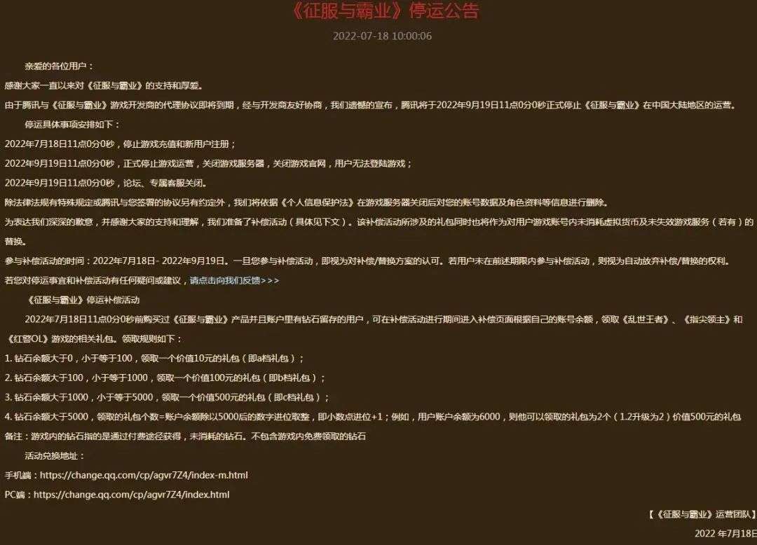7 月 18 日,《征服与霸业》在官网发布停运公告称,腾讯将于 2022 年 9 月 19 日 11 点 0 分 0 秒正式停止《征服与霸业》在中国大陆地区的运营。