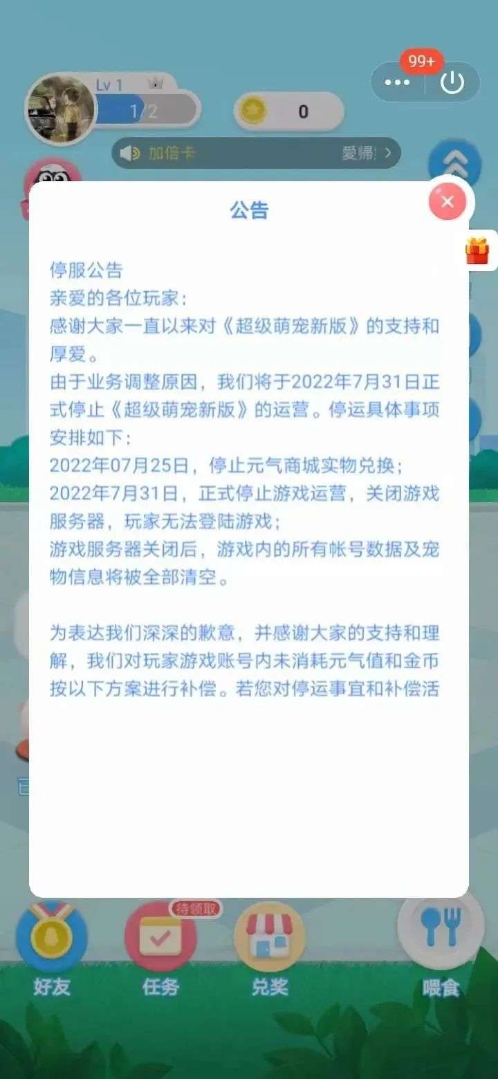 由于业务调整原因,腾讯于 2022 年 7 月 31 日正式停止《超级萌宠新版》的运营,关闭游戏服务器,玩家无法登陆游戏。