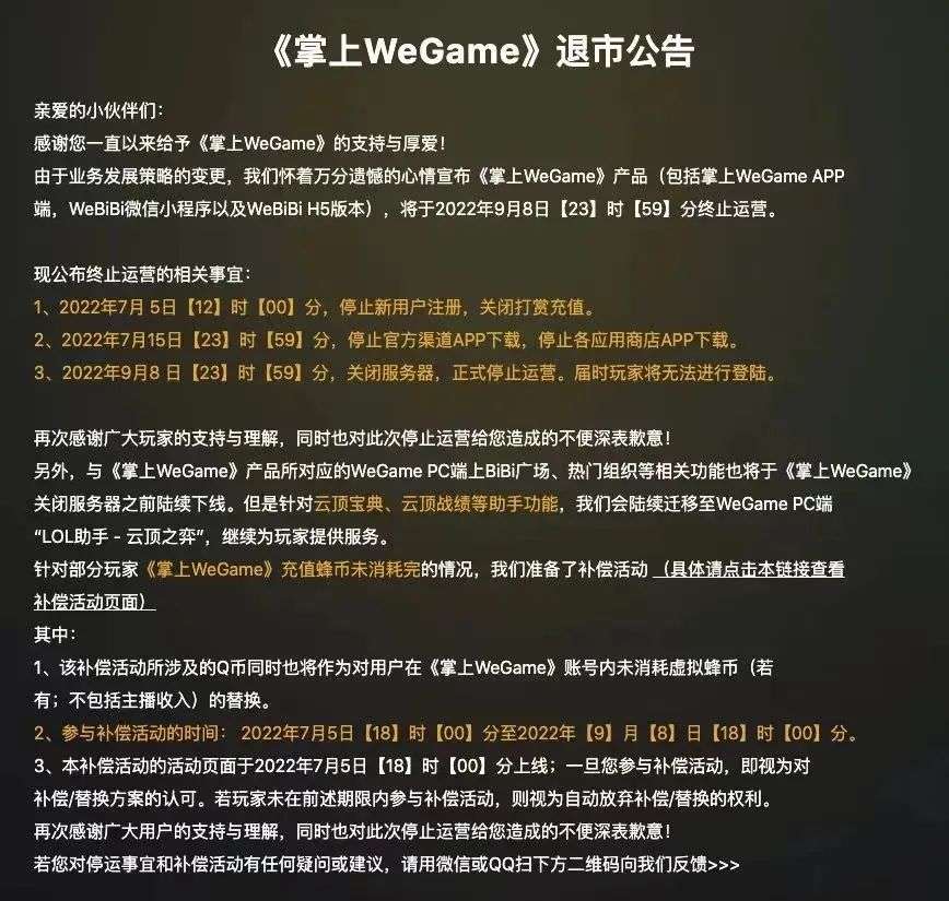 腾讯《掌上 WeGame》运营团队发布《掌上 WeGame》退市公告称,《掌上 WeGame》产品将于 2022 年 9 月 8 日 23 时 59 分终止运营。