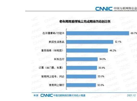 而更细致的数据在于:能独立完成出示健康码/行程卡、购买生活用品和查找信息等网络活动的老年网民比例已分别达69.7%、52.1%和46.2%。