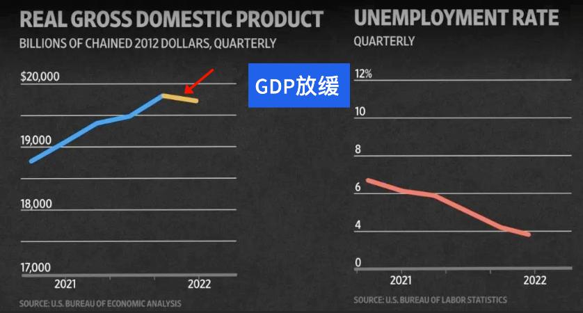 当GDP大跌时,蓝色的线,伴随着失业率上升,红色的,而2022年当下的情况是,GDP开始出现放缓,符合经济衰退的定义,就连美联储主席鲍威尔称经济衰退,但是我们现在的失业率正在下降,更多的人找到了工作而不是失去了工作。以至于我们现在不能分辨现在是否是经济衰退。我们只能说如果经济衰退真的来临,那一定是我们从未见过的衰退。
