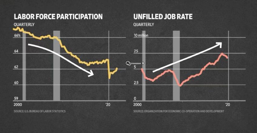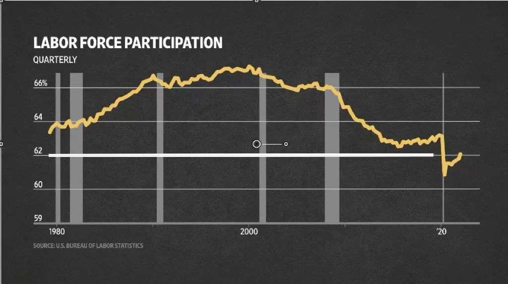 现在是就业市场的一个特殊时期。劳动力参与率是40年来最低的,这并不全是由于疫情。这一比率在很长一段时间内一直在下降,你可以从空缺职位的比率中看到这一点。