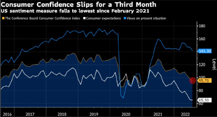 经济衰退可能从上述任何一个阶段爆发,2022年人们已经开始削减开支。我们看看消费者信心指数就知道了。消费者信心指数衡量的是人们对经济的感觉,是预测经济走势和消费趋向的一个先行指标,是监测经济周期变化不可缺少的依据。
