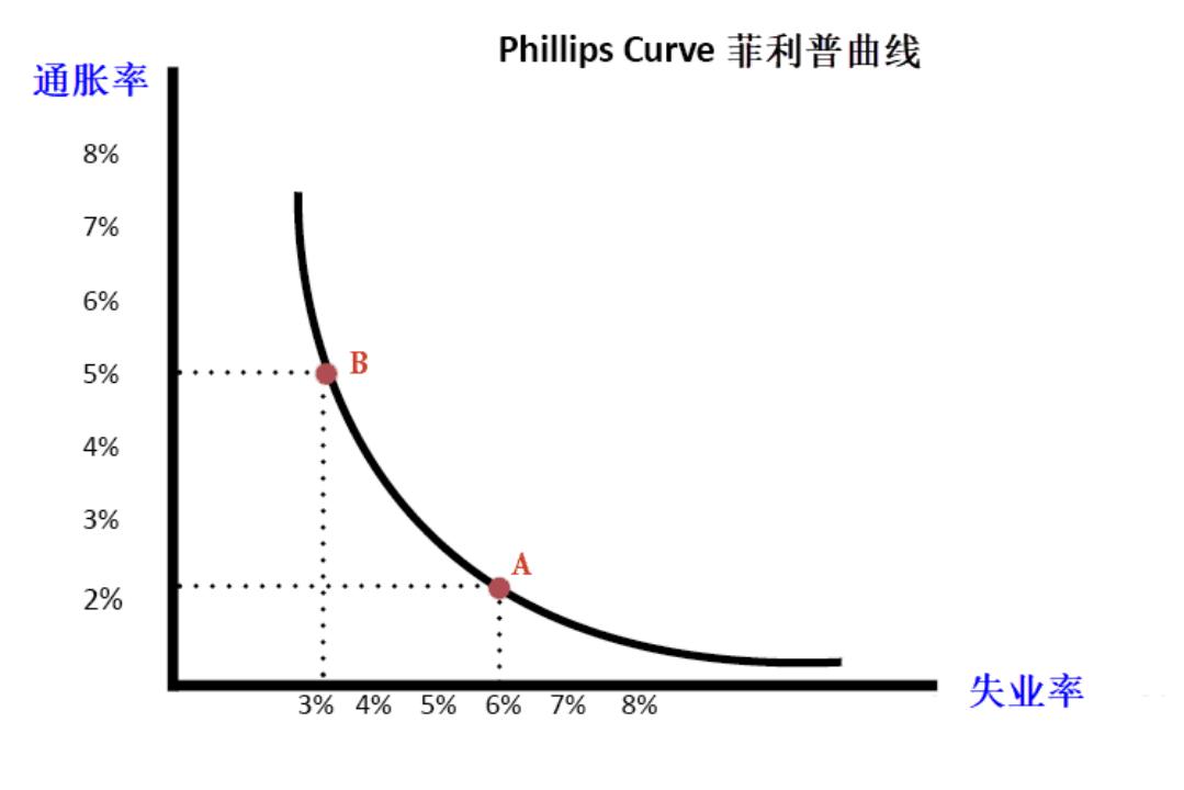 根据经典菲利普斯曲线,失业率与通胀存在负相关关系。通胀率高失业率低,反之,失业率提高,通胀就回落。因为通货膨胀是由工资成本推动所引起的,企业难招人必定会提高工资,但市场出现找工作的人多了,招聘的工资水平就降低。