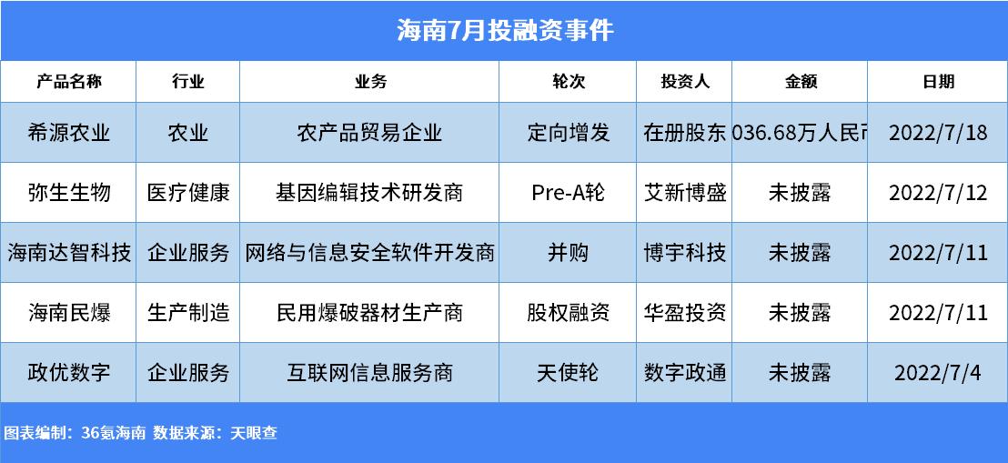 7月,36氪海南统计了海南省内发生的5起投融资交易事件,相关企业5家,其中天使轮1起:政优数字;Pre-A轮1起:弥生生物;并购1起:海南达智科技;股权融资1起:海南民爆;定向增发1起:希源农业。