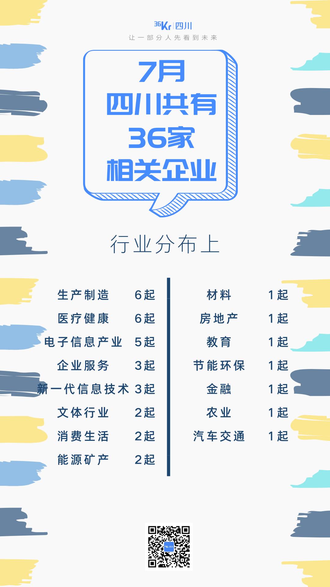 7月,36Kr四川通过公开渠道,共收录与四川相关的融资、上市等事件36起,相关企业36家。其中:获得投融资方面,天使轮5起,Pre-A轮1起,A轮9起,A+轮1起,B轮5起,战略投资6起,IPO上市4起,并购5起。
