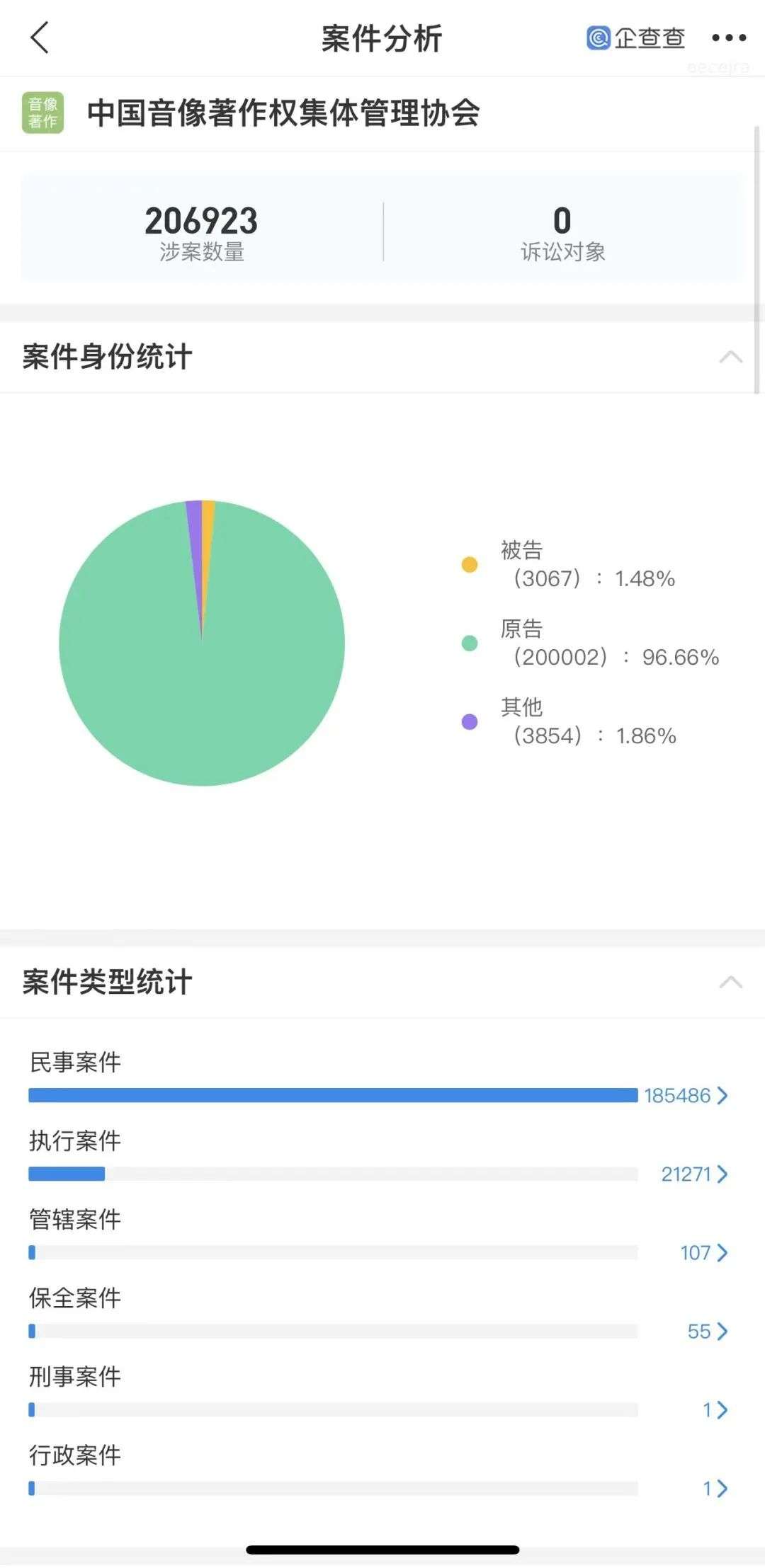 在企查查中搜索“音集协”,共涉及206924个案件,96.66%的案件身份为原告,其中69471个案件为著作权权属、侵权纠纷;52649个案件为侵害作品放映权纠纷;10404个案件为著作权权属纠纷;其他案件也大多与知识产权相关。
