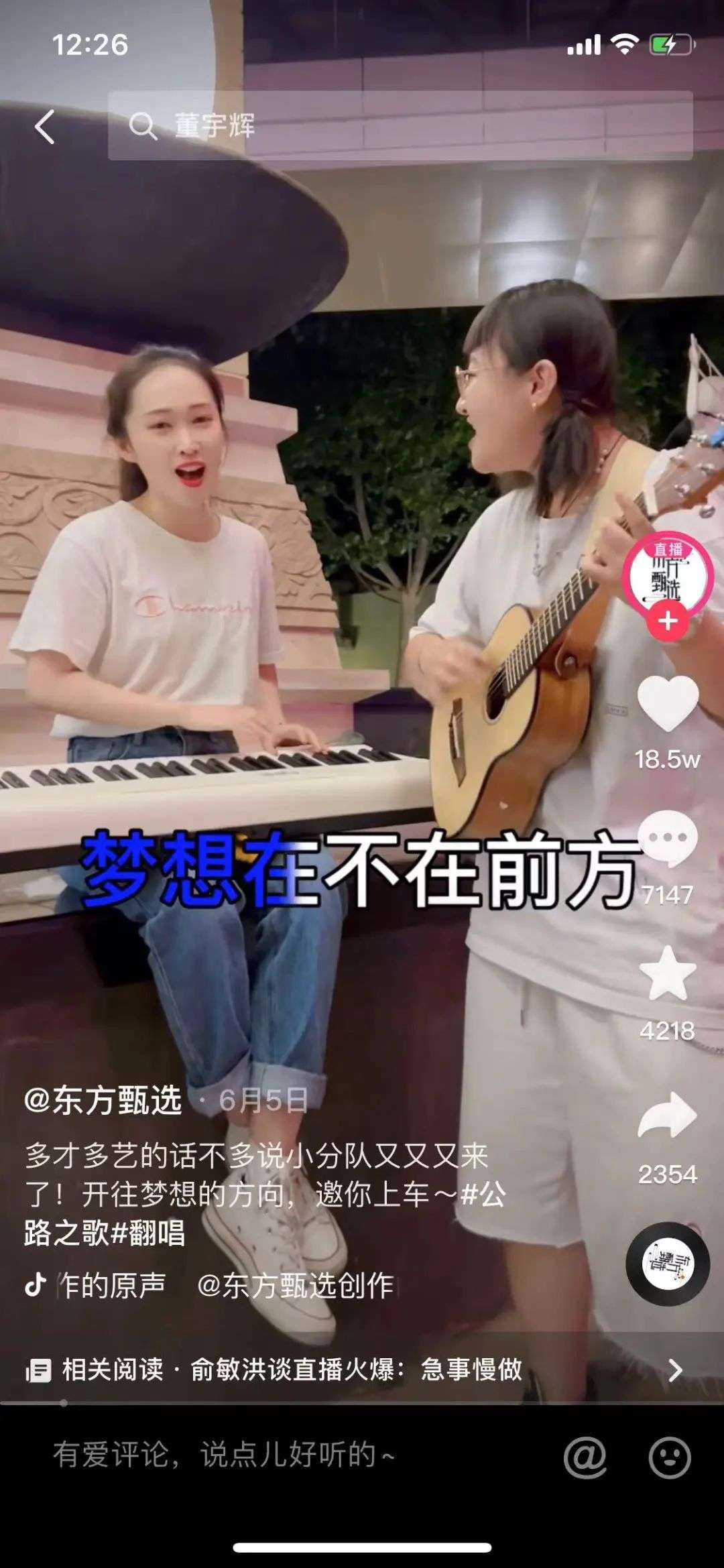 最近“网红电商”东方甄选直播间里,音乐更是成为不少主播直播的“卖点”。卖几件产品,就唱一首与之相关的歌曲,寓教于乐的形式,帮助东方甄选主播吸粉无数。