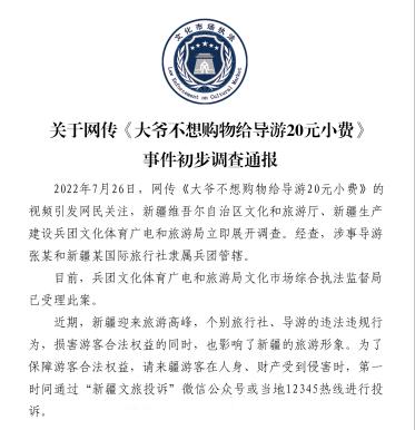 对此,吐鲁番市文旅局工作人员说经初步调查,涉事导游为乌鲁木齐当地导游,事发时,正带旅行团来吐鲁番市游玩。目前,涉事导游和旅行社正在接受调查。