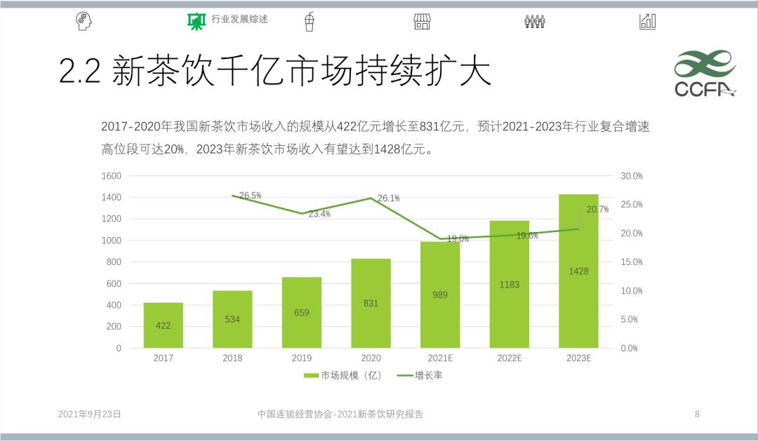 年初以来,喜茶被爆裁员30%奈雪的茶市值持续下滑,相去发行价跌去过半,第一梯队的这批高端品牌半年内经历两轮降价;而第二梯队的乐乐茶、茶颜悦色等品牌,更是在不断地方性闭店的消息之中,屡屡被传公司运营不善……整个行业红利不再泡沫凸显,根据中国连锁经营协会《2021新茶饮研究报告》,未来两三年,新茶饮整体增长速度由原先的超23%预计放缓至10-15%。