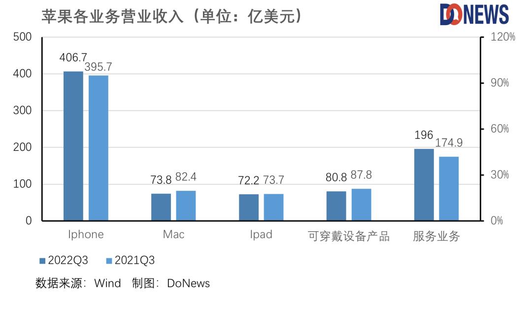 2022财年Q3,iPhone营收406.7亿,较去年同期395.7亿,同比增长3%;Mac营收73.8亿,较去年同期82.4亿,同比下滑10%;iPad营收72.2亿,较去年同期73.7亿,同比下滑2%;可穿戴设备产品营收80.8亿,较去年同期87.8亿,同比下滑8%;服务业务营收196亿,较去年同期174.9亿,同比增长12%。