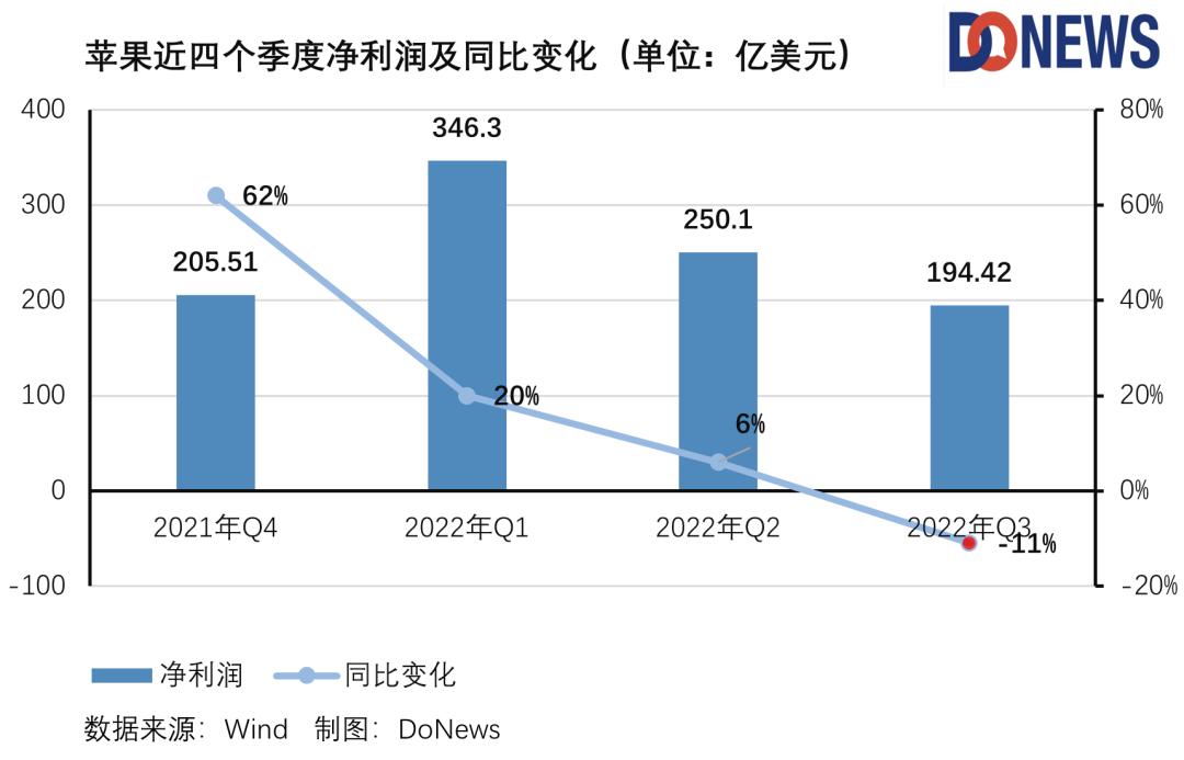 此前苹果已经连续三个季度,净利润同比增长放缓。2021财年Q4,苹果净利润205.51亿,同比增长62%。相比于2021财年,净利润呈现双位数甚至三位数同比增长的表现,2022财年,苹果Q1净利润346.30亿,同比增长20%;2022财年Q2,净利润250.1亿,同比增长6%。