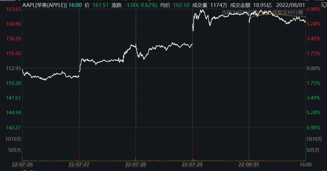 财报发布当天,美股三大指数集体收涨,苹果股价涨0.36%,报收157.35美元/股,盘后涨超过3%。