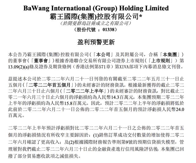 7月27日,霸王集团更新了盈利预警,根据最新的截至2022年6月30日未经审计的财务资讯显示,公司上半年录得净亏损约为1430万元。此前,霸王集团预计2022年前五个月净亏损为2400万元。