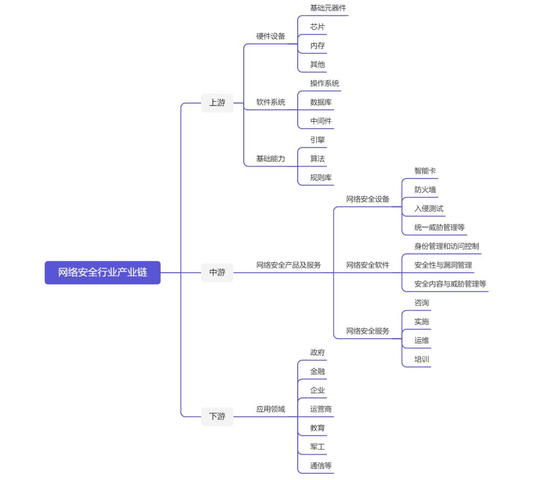 中国的网络安全行业产业链涉及范围广泛,主要包括上游基础技术、中游网络安全产品和服务,下游多领域应用。
