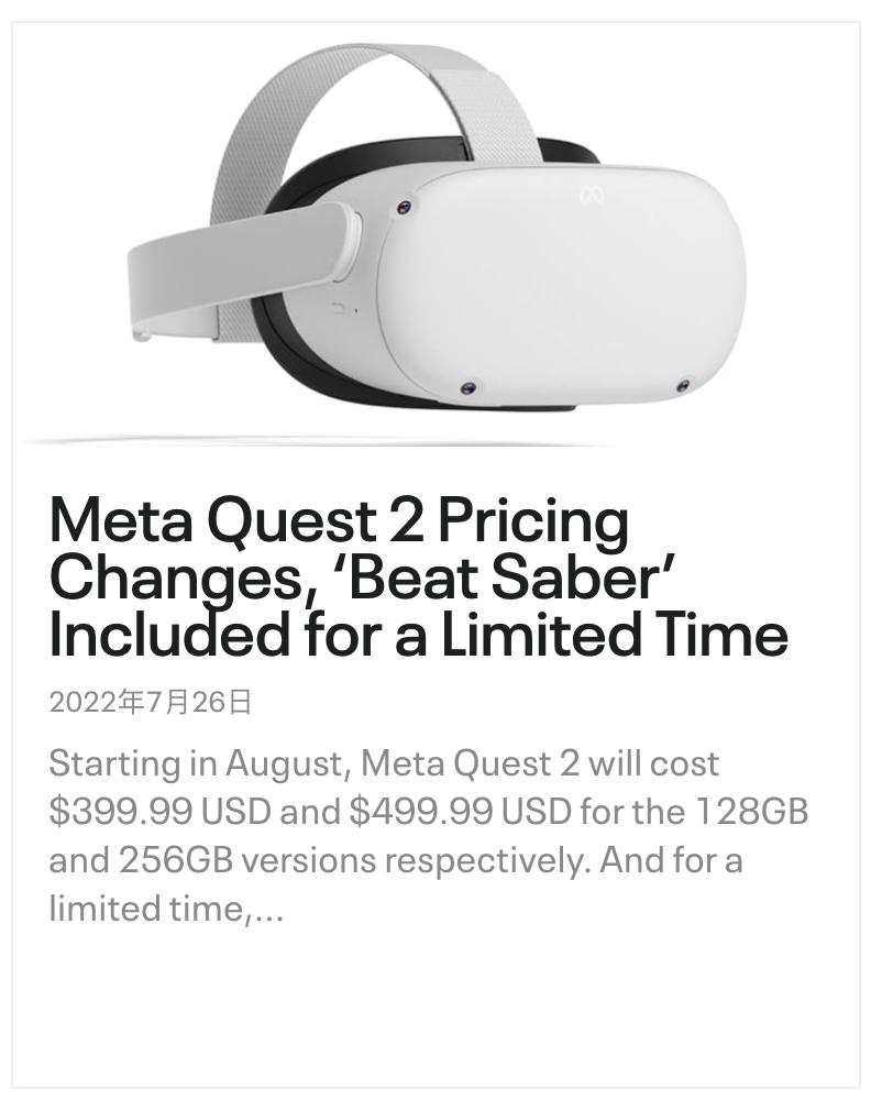 上个月底,Meta在Oculus博客上更新了一条消息,表示自家旗下最新的一体式VR头显Meta Quest 2,从8月开始将会迎来一波价格上调。