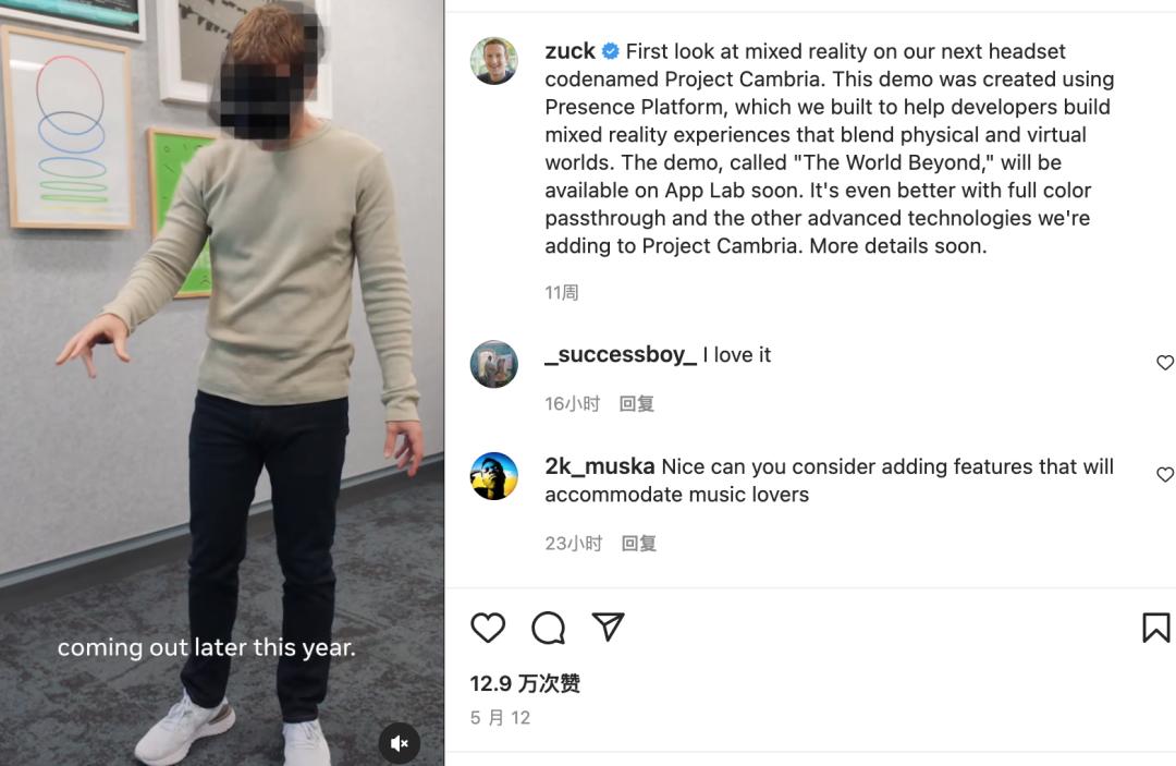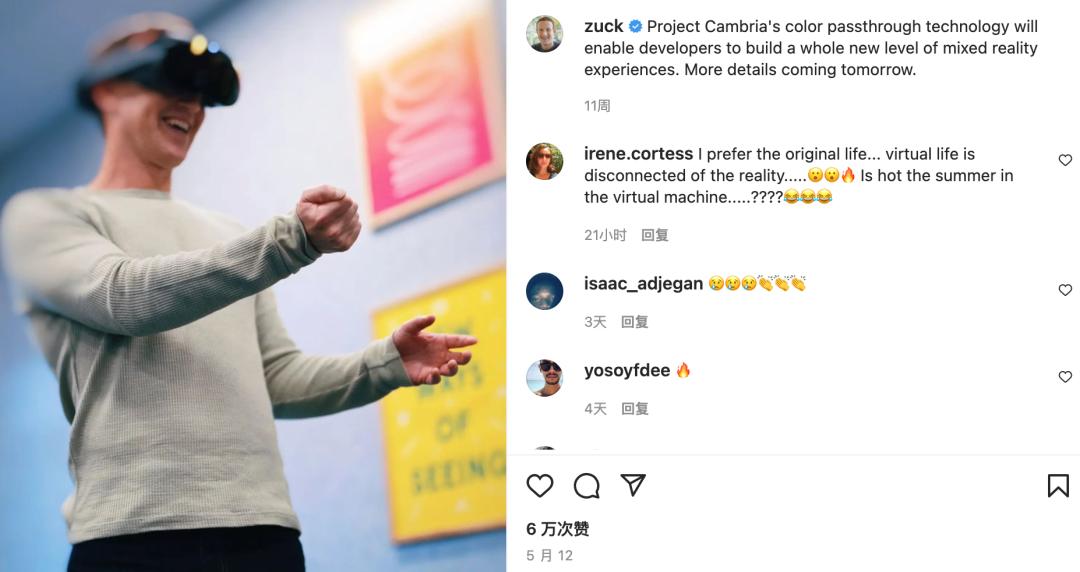 为了给这款神秘新品站台,小扎本人已经不止一次在自己的社交媒体上放出自己的体验感受,可见Project Cambria在Meta内部权重之高。