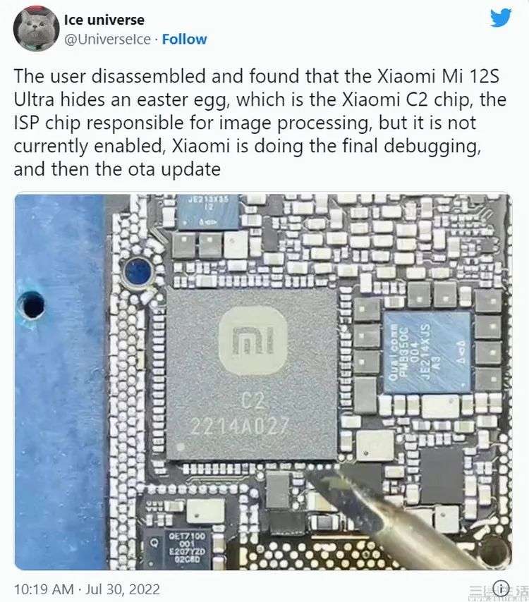 当然,被米12SU热度所吸引而来的,不只有手机和摄影的爱好者,也会有更加较真的硬核玩家。几天前,就有网友通过拆机发现,米12SU的主板上还有一颗标注着“C2”的芯片,疑似是目前还未启用的“澎湃C2”独立ISP。