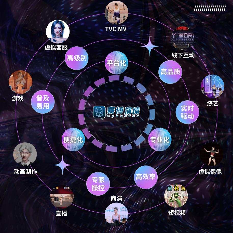 “赛博演猿”可广泛应用于虚拟直播、虚拟偶像、短视频、动画制作、虚拟演播室节目制作、元宇宙会议等领域场景,既可以为广播级客户提供专业化的定制服务,也可以工作室提供弹性化的解决方案,还可以为普通用户提供SaaS化的随时随地服务。