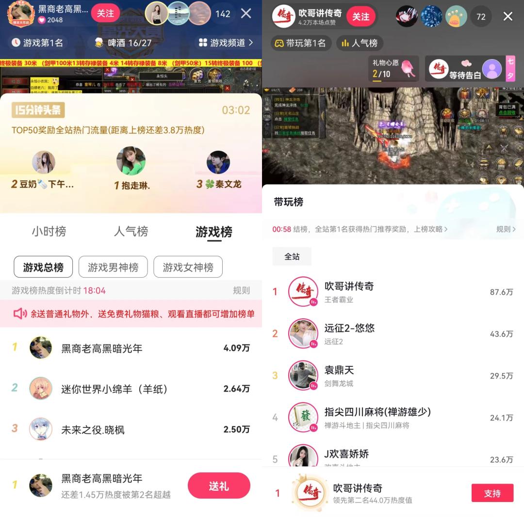 如上图所示,从两大平台相关榜单来看,传奇类游戏在快手直播游戏总榜、抖音带玩榜上,常居Top10。