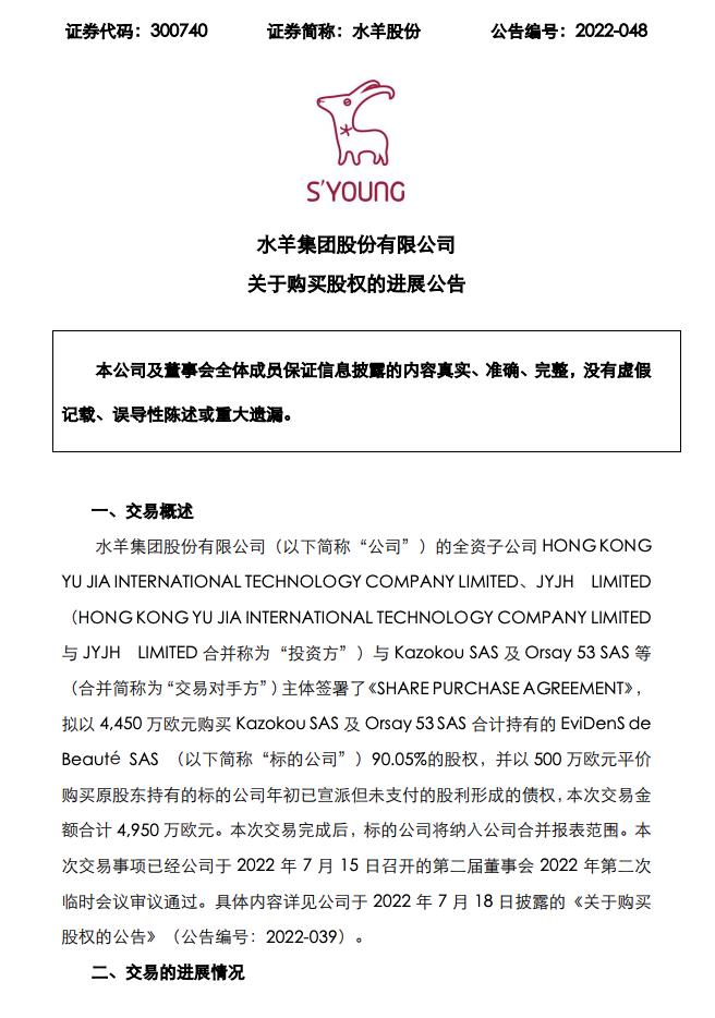 稍早间,水羊股份披露的一则关于购买股权的公告显示,水羊股份全资子公司与Kazokou SAS 及 Orsay 53 SAS 等签署了《SHARE PURCHASE AGREEMENT》,拟以4450万欧元购买伊菲丹母公司90.05%的股权,并以 500万欧元平价购买原股东持有的标的公司年初已宣派但未支付的股利形成的债权,交易金额合计4950万欧元。