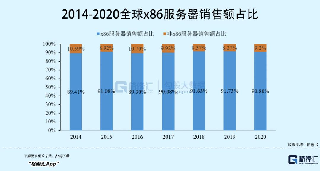 其中,X86服务器的生态环境具有明显的优势,全球应用x86处理器的服务器销售额占全部服务器销售额的比例约为91%,销售量占比超过97%。