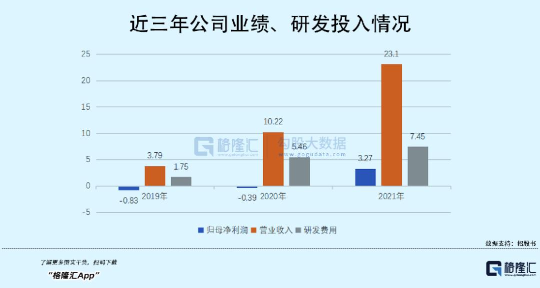 业绩方面,2019年-2021年公司营收分别为3.79亿元、10.22亿元和23.1亿元,对应的归母净利润分别为-0.83亿元、-0.39亿元和3.27亿元。