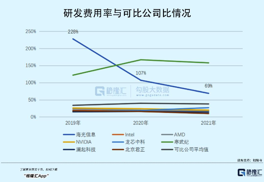 不过需要注意的是,海光信息的研发支出资本化占比较高,形成的自研无形资产金额较大。报告期内,公司研发支出资本化的金额分别为6.89亿元、5.58亿元和8.40亿元,占比分别为79.71%、51.18%和 53.02%,存在一定的无形资产减值风险。
