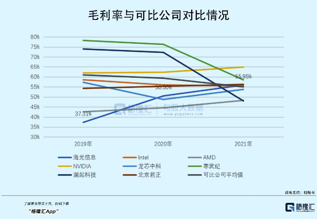 近三年海光信息的营收快速增长,2021年利润实现扭亏为盈,并弥补了历年累计亏损;同时毛利率逐年提升,目前已赶上可比公司的平均水平。