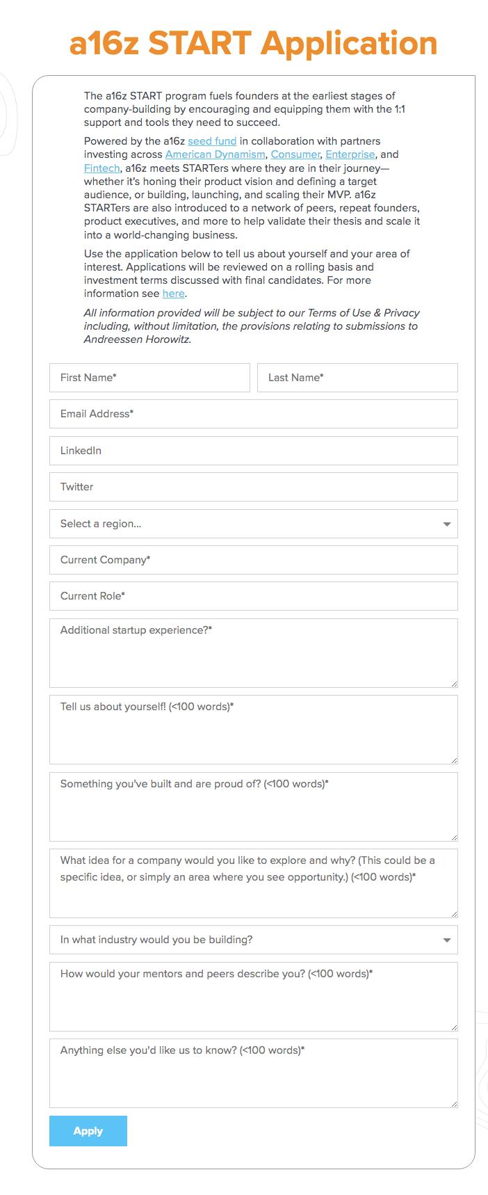a16z也在4月推出、加速器项目START,为早期创始人提供100万美元的资金来交换部分股份,股份比例未知,由去年完成4亿美元融资专为种子轮投资特设的基金支持。申请者可以只有一个点子此外啥也没有甚至目前的身份还只是一个普通的打工人,或者已经拥有了MVP准备推向市场,申请者还可以来自全球各地,项目是远程进行的。目前它关于这一项目对外透露的信息还不是很多,连申请表格都走极简风格👇
