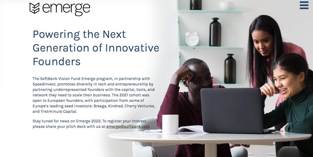 软银在去年与欧洲风投Speedinvest合作推出了加速器项目Emerge,面向欧洲市场开放,Emerge以多元化为重点,至少有一位创始人是非白人、女性、残疾人或难民,申请公司需在种子轮阶段并已经拥有产品雏形,商业模式已经获得了消费者认可并展示出了增长实力,参加者将会获得资金、培训、社群、人脉等多个方面的支持。
