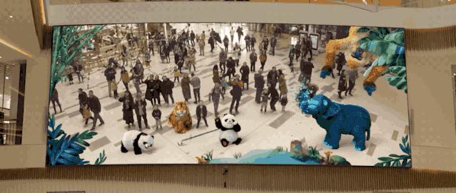 成都仁和新城的中庭成为了消费者打卡的圣地,这里有一块特殊的LED大屏,消费者可以跟屏幕里的动画进行实时互动。