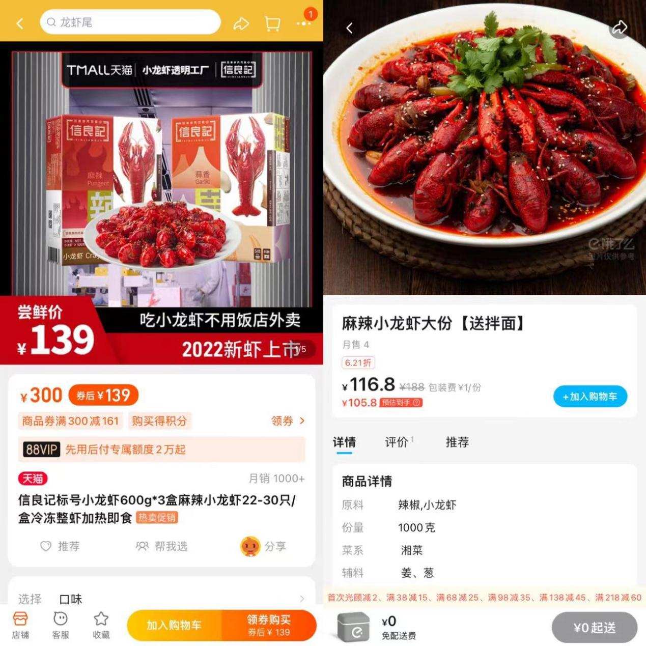 在信良记天猫旗舰店,一份600克*3盒规格的麻辣小龙虾,券后价139元。而「螳螂观察」在外卖平台任意搜了一个餐饮品牌的麻辣小龙虾,1000克规格折后售价为116元。
