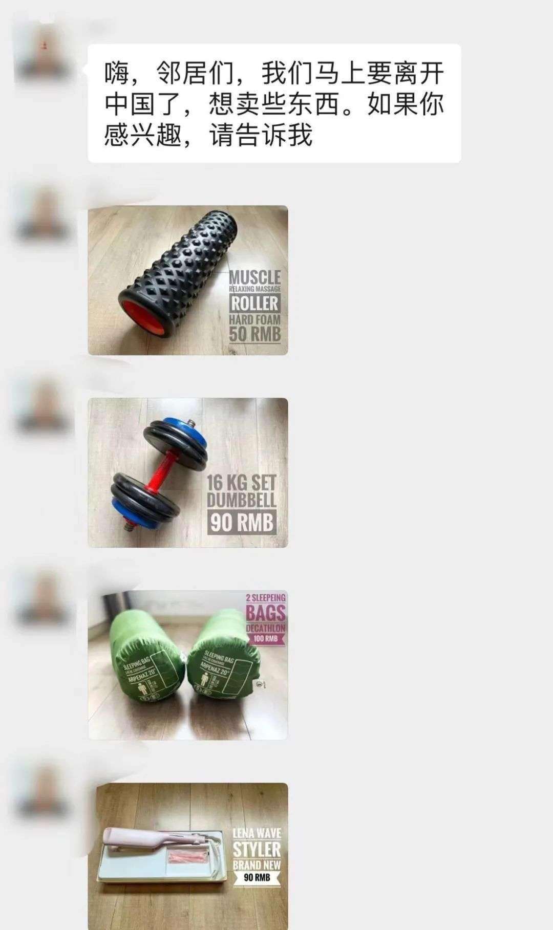 用过没几次的带额外镜头的旧款单反相机(仅售4000元),还能工作的Walkman(几乎是白送),基本全新的健身用哑铃、壶铃(10元一个)和跑步机(100元自提),全新的欧式实木麻将桌(160元自提)……也有人把疫情期间冲动购买的速食、预制菜和饮料便宜卖出去甚至送出去。
